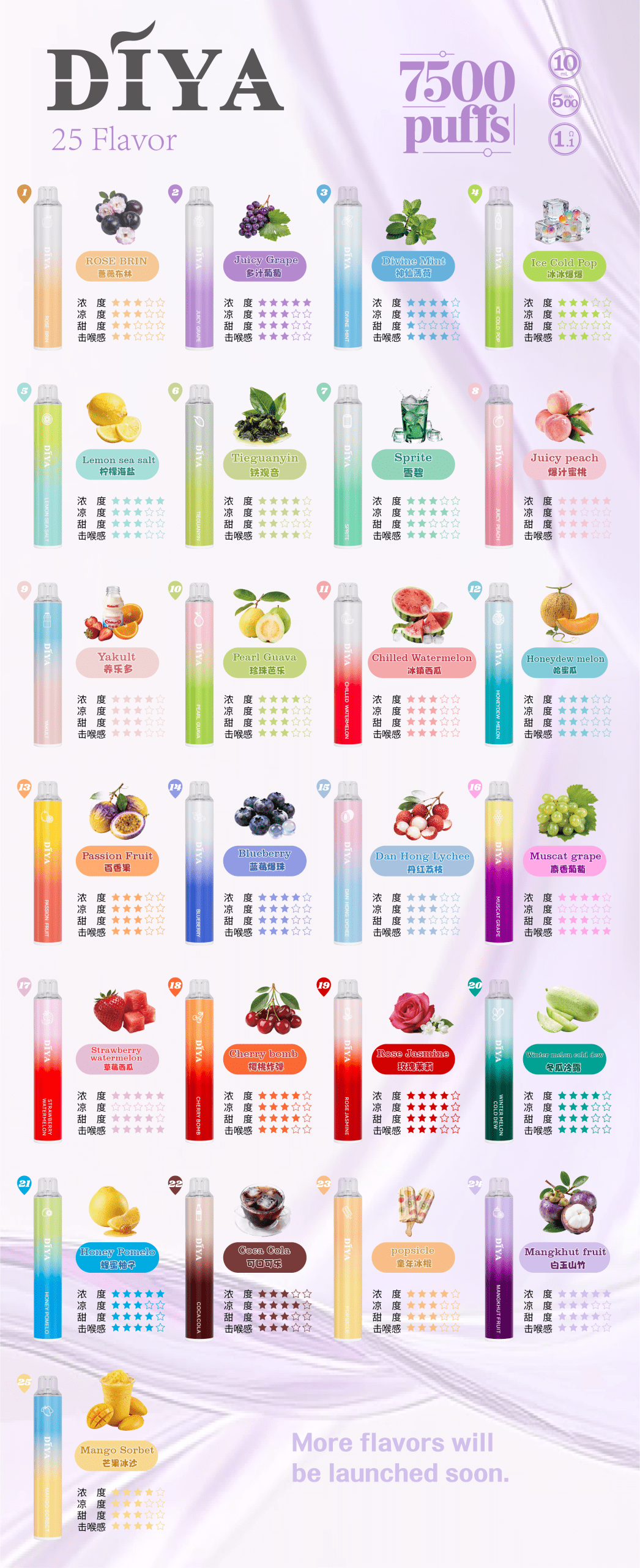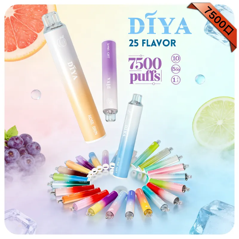 DIYA 7500口 拋棄式電子煙:13ml 透明油倉、1.2Ω 網狀線圈、25款風味及兩款不涼風味,口感細膩不乾燒。台灣電子煙線上購買商城,承諾所有商品為台灣現貨 24H 發貨,支持超商貨到付款。